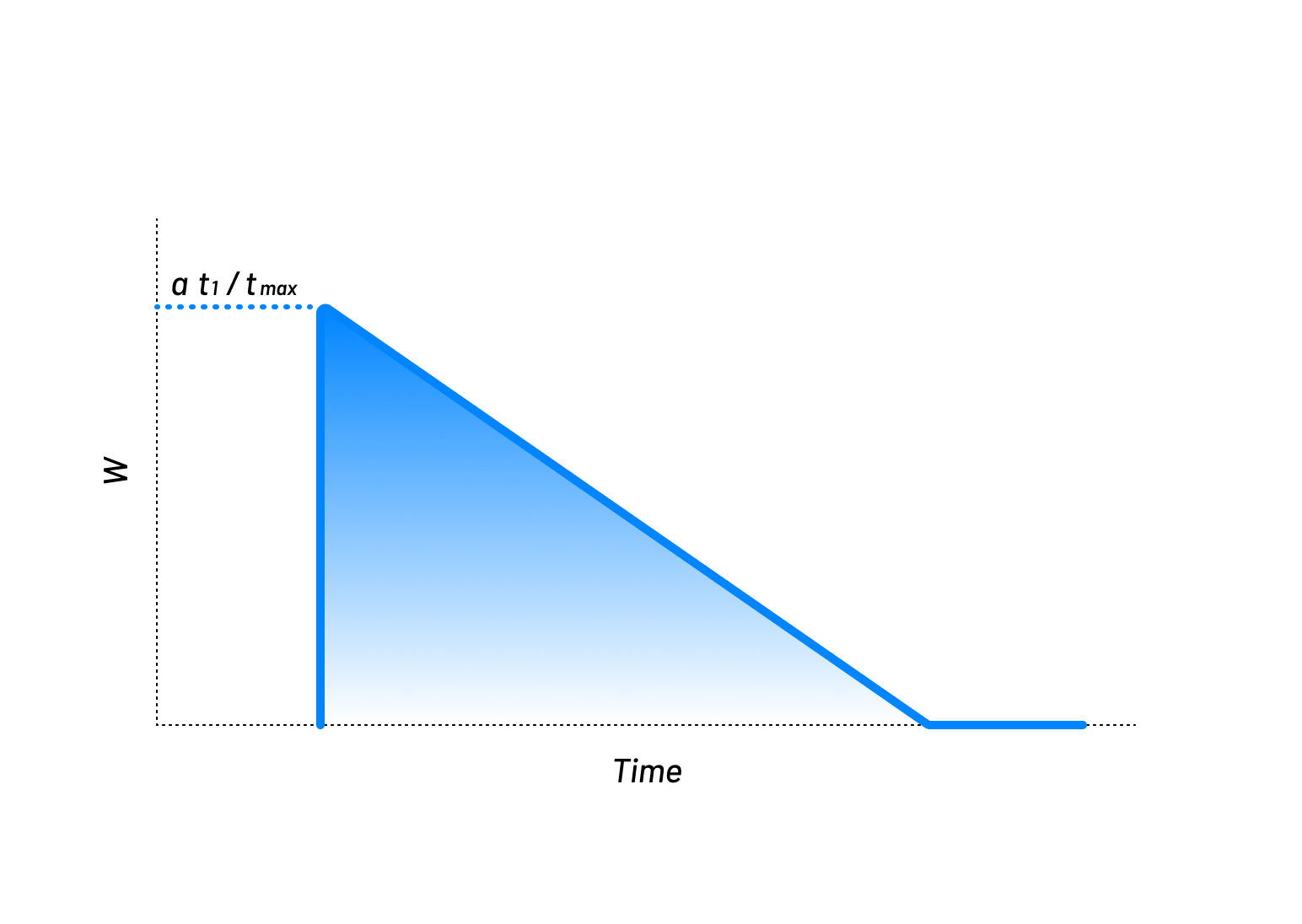 Instead of granting protocol share and voting power just with the token amount $$a$$, in Splash Protocol tokens are lockable in a Voting Escrow Contract for a selectable lock time $$t\_l$$, where $$t\_l < t\_{max}$$, and $$t\_{max} = 1 year$$. After locking, the time left to unlock is $$t ≤ t\_l$$. The share is equal to: